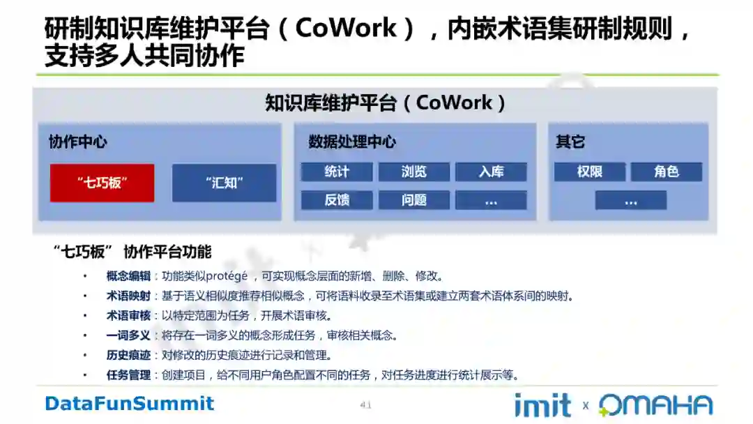 Step6:平台及工具支撑。自研的知识库维护平台(CoWork),内嵌术语集研制规则,支持多人共同协作。CoWork中“七巧板”的功能如下所示: