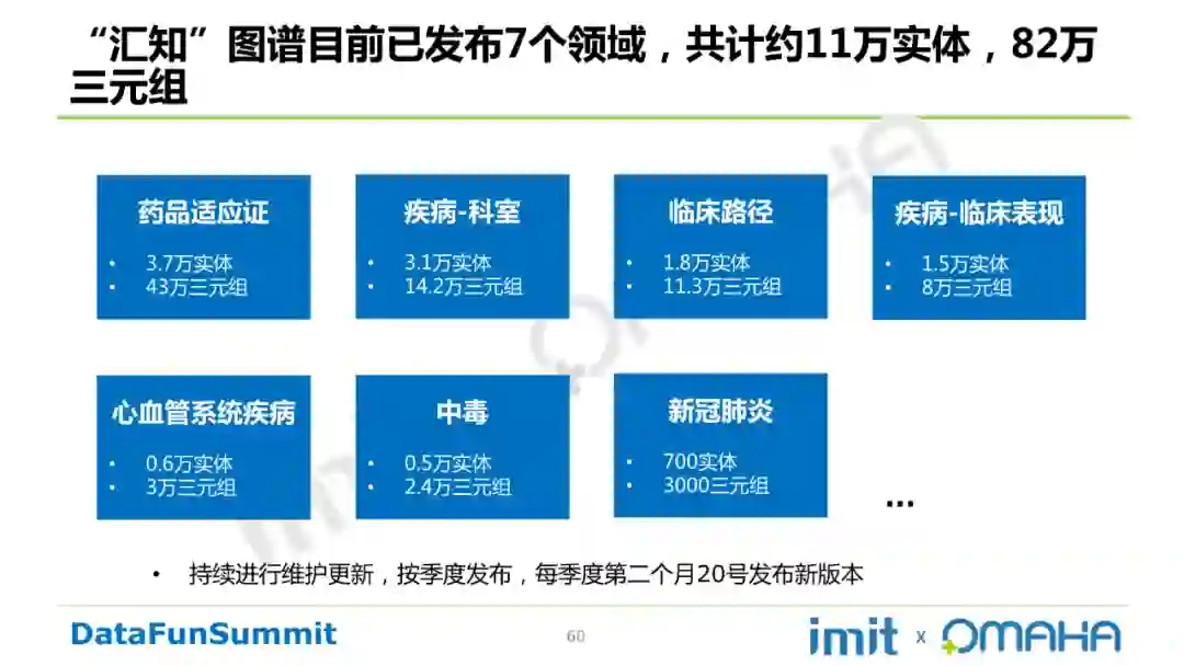 医药卫生知识服务系统:由中国医学科学院医学信息研究所承建,通过对资源的深度挖掘和关联分析,建设了知识图谱、知识脉络分析等特色知识服务和应用。其规模:已发布疾病和药品领域知识图谱,其中疾病涵盖心脑血管疾病、呼吸系统疾病、免疫系统疾病、消化系统疾病、肿瘤等。