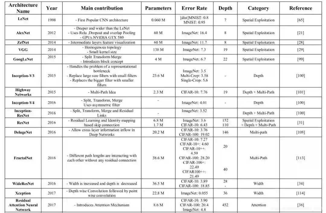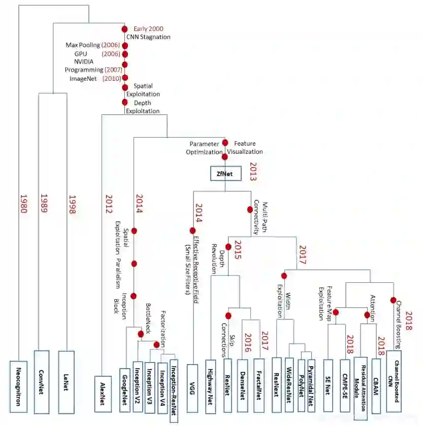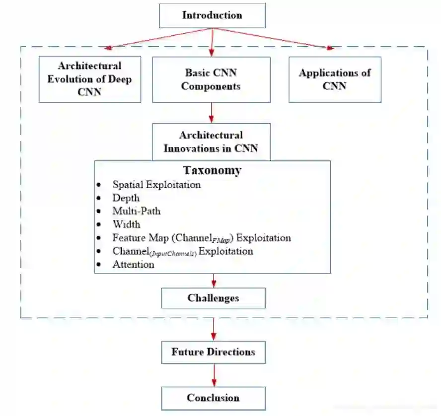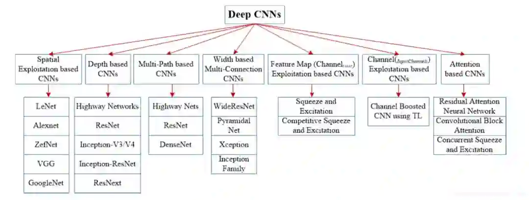 因此,本综述着重于最近报道的深度CNN架构中存在的内在分类法,将CNN架构中的最新创新分为七个不同类别。