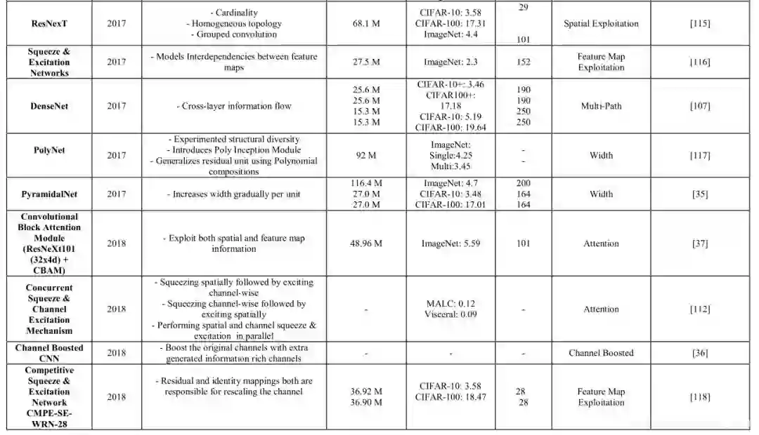 这七个类别分别基于空间利用、深度、多路径、宽度、特征图利用、通道提升和注意力。
