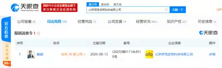 ofo小黄车关联公司法定代表人戴威再被限制消费