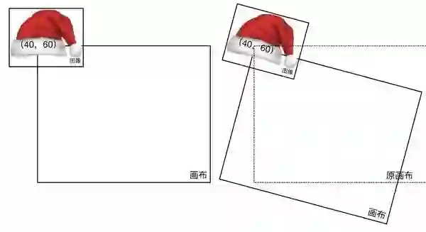 这里,我们只想让图片按照中心旋转怎么办?我们可以先让 Canvas 把原点平移到帽子的位置,然后再通过帽子的内部偏移使得帽子中心刚好在原点,此时再旋转画布把帽子画上就只影响这一个帽子图片了。