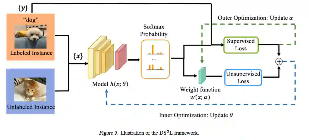 这篇论文介绍了一个简单有效安全的方法:DS3L(Deep Safe Semi-Supervised Learning)。不像其他深度半监督学习模型,DS3L并不是利用所有的无标签数据集,而是有选择的并且跟踪监督学习模型的影响来避免「性能灾难」。