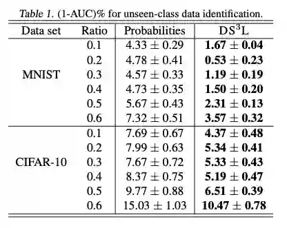 通过将未知分类的无标签数据视为否定类别,将其他未知分类的数据视为肯定类别,AUC值可用于衡量识别能力。表1显示了不同类别不匹配率下的实验结果。可以看出,与基于概率的方法相比,DS3L降低了未知分类无标签数据的错误分类率。