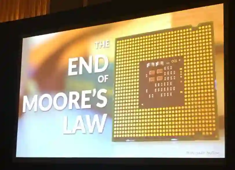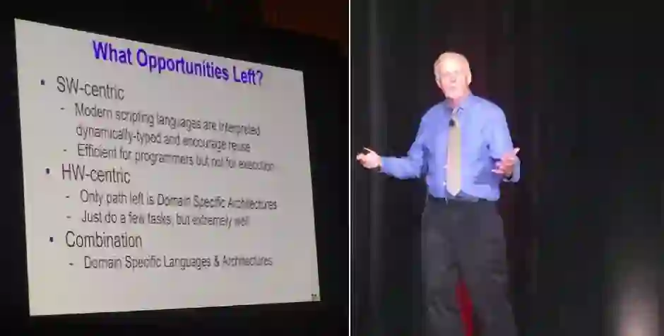 John Hennessy在演讲中指出,随着摩尔定律的终结,我们需要新的计算机架构研究方法。图片来自ACM Twitter