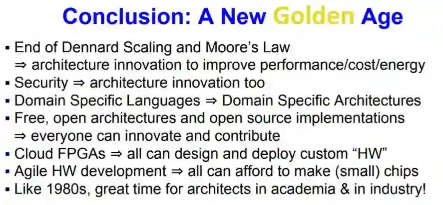 在图灵奖演讲中,2017年图灵奖获得者John Hennessy教授指出了,随着摩尔定律的终结,我们需要新的计算机架构研究方法。他预言,计算机架构团队纵向整合的时代即将复兴,体系结构设计者将如过去一样,不仅需要了解底层器件,工艺,以及电路的知识,也需要有着对编程语言以及编译器的了解。John在总结中慷慨激昂地提到:“一切旧的东西又是新的!(Everything old is new again!)”