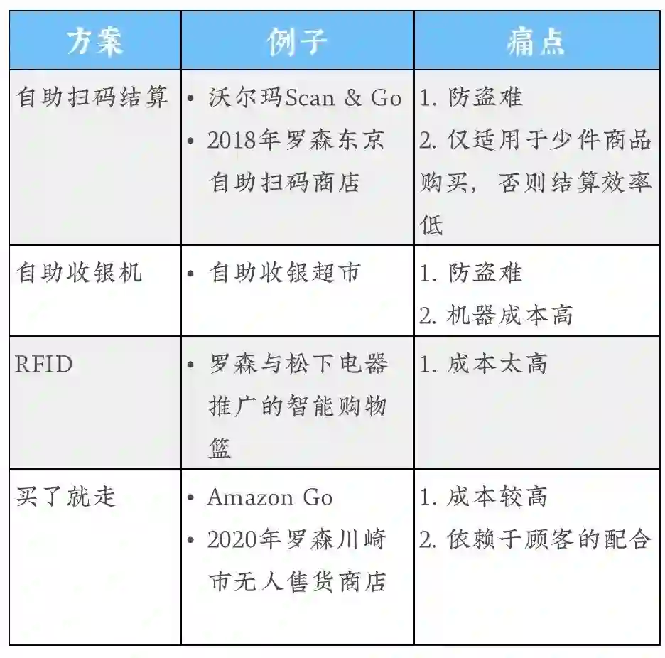 前两者没有太多技术含量,也很好理解。但这两种模式的推广,非常依赖于消费者的自觉。否则,节省的人力成本很容易被盗损拉平,甚至损失更大。由于盗损率过高、结账效率低等原因,沃尔玛的“Scan & Go”于2018年4月宣告失败。
