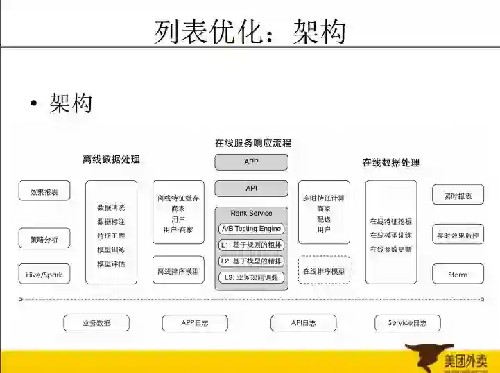 这个图是整个列表的一个架构,可以分为三个方面: 第一部分就是日志,这个数据分析、策略的源头;第二部分是我们离线处理,包括我们策略的分析、模型训练;第三部分为在线服务,前端打请求到API,API再请求对应的在线服务,这个有一些具体的模块:abtest测试框架,触发、排序框架,此外还有一些在线的实时的数据处理。