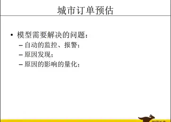 通过模型需要解决的问题:首先需要做自动的监控、报警;第二模型需要发现其中造成异常,这个异常的原因是什么;确定这个原因之后,那我们需要知道这个原因对我们订单量到底是什么样一个影响,是一个量化的事情。