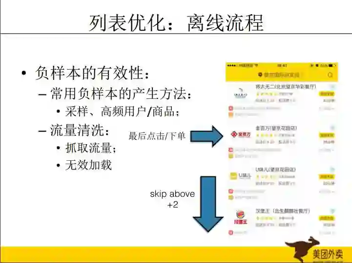 这模型训练过程中遇到的一个问题是如何选择负样本,正样本是用户显式的反馈。在很多场景都会遇到这个问题,没有负样本怎么办?会做负样本的选取。有几种方法:1,随机选取;2,选取用户没有行为的热门商品;3,从行为较多的用户的候选集合中选。负样本选取本质上是在猜可能看了什么但没发生行为,所以猜的越准,效果越好。在外卖列表场景下,我试了Skip-above的效果还不错。