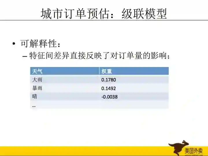 首先我们会利用历史订单建立一个自回归模型;第二步,会利用真实值/第一步预测值作为label,建立“倍数”模型。如果第二模型出来是一个1.2的值,我比第一步预测的基础之上我再涨20%。这样建模有两个优点:1,利用boosting的思想,精度得到进一步提升;2,借助于第二步的模型,做到较好的可解释性。