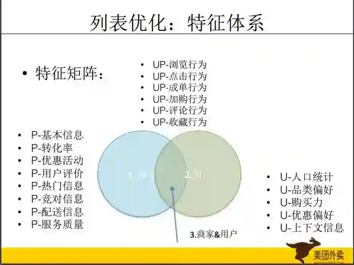 这是特征体系,传统做特征体系有三个方面,第一个是场景,第二个是用户,第三个是商品,两两相交,三者相交,有七个象限。在外面应用中,场景的特征不是太强,主要特征有三类就够了,一类是商家,第二个是用户,第三个是两者相交的部分,每个类型列举了一些例子。