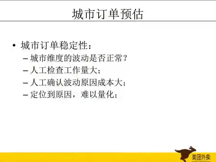 从城市纬度去看订单量的预估,这个里面第一个出发点是什么?每个城市都会有波动,这个波动到底是否是正常的,这个时候我们需要进行人工,每天有一百多个城市都需要确认,这个工作量非常大。影响这个订单量背后的因素非常多,人工的方法很难确认到底这个波动由哪个因素造成的。即使找到了这个因素,这个因素带来的订单量增长的一个具体的数量,人工不太好确定的,这是是人工做的时候遇到的一些问题。