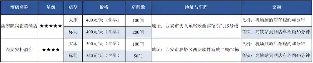 本次大会选取西安高新国际会议中心附近的酒店作为各参会代表的住宿酒店。住宿酒店(除西安安朴酒店外)组委会将安排大巴车统一接送。西安安朴酒店距西安市高新国际会议中心较近,约5分钟车程,步行约15分钟。酒店预订链接: