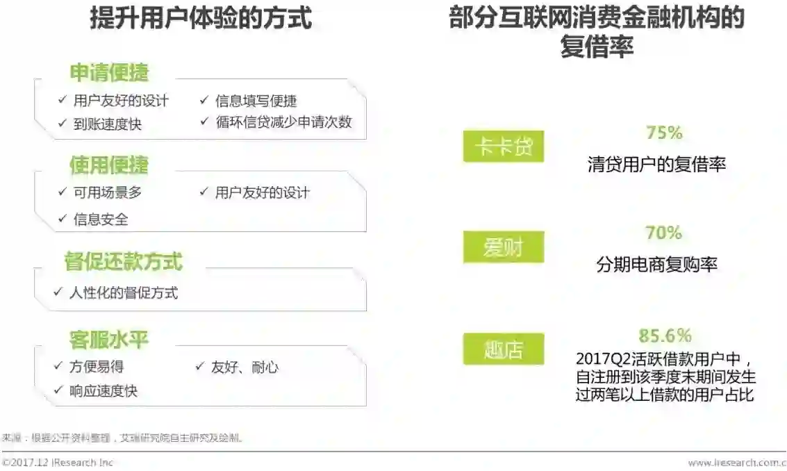 在获客成本日渐提升的当下,提升用户体验的价值日益凸显。提升用户体验,挖掘用户在同一平台再次借贷的需求,能帮助互联网消费金融机构省去部分获客环节的成本。提升用户体验的方式包括申请便捷、使用便捷、人性化的督促还款方式以及良好的客服体验。衡量互联网消费金融机构的用户体验水平,用户复借率是个重要指标。根据公开资料,卡卡贷、爱财、趣店的复借率在70%以上,但由于各自统计、计算口径不同,无法进行横向比较。