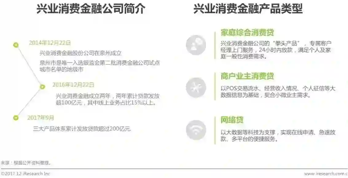 兴业消费金融起源于福建省泉州市,2013年泉州市作为唯一的地级市入选银监会第二批消费金融公司试点城市名单,2014年12月22日,兴业消费金融股份公司在泉州成立。2016年12月22日,兴业消费金融成立两年,两年累计贷款发放超过100亿元,其中线上业务占比15%以上,且这一比重呈现逐步上升趋势。兴业消费金融产品包含“家庭综合消费贷”、“商户业主消费贷”和“网络贷”三大体系,截至2017年9月,三大体系累计发放贷款超过200亿元。