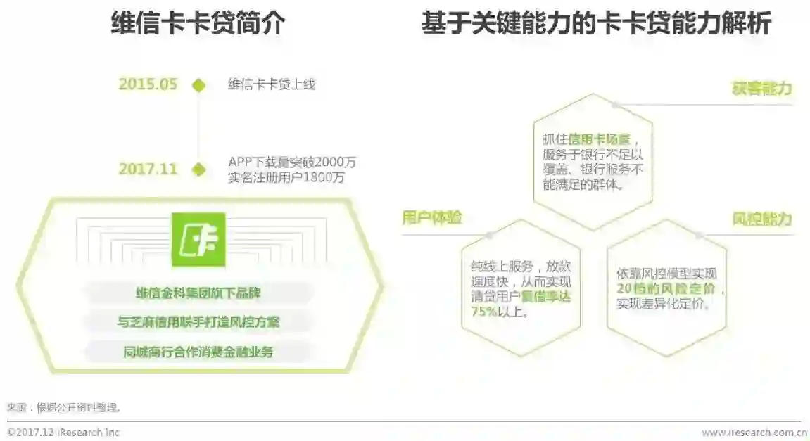 “维信卡卡贷”于2015年5月上线,是维信金科集团旗下的移动互联网贷款服务平台,为银行持卡人提供信用卡余额代偿服务。截至2017年11月,维信卡卡贷实现APP下载量突破2000万,实名注册用户1800万,成为信用卡代偿场景消费金融机构中的佼佼者。就开展消费金融业务的三大能力而言,在获客能力方面,维信卡卡贷抓住了信用卡场景,成为其获客的重要来源;在用户体验方面,维信卡卡贷利用优质服务实现了清贷用户75%的复借率;在风控能力方面,维信卡卡贷后台有20档定价,根据用户资质不同实现自动化风险差异化定价。