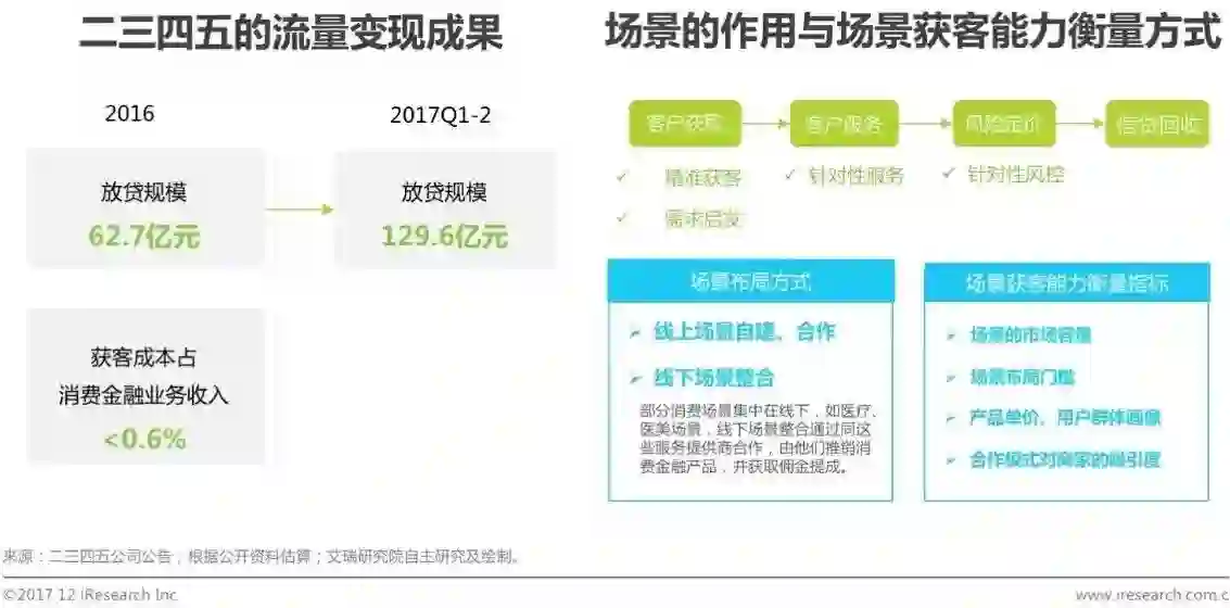 获客能力是互联网消费金融业务的三大关键能力之一,如何付出最少的成本获取最大的利息、服务费收入,是提升消费金融获客能力的目标。实现该目标有两种主要方式,第一种是有流量的企业搭建互联网消费金融业务,在不用额外付出流量成本的情况下开展消费金融业务,典型企业有二三四五、微博、搜狗、搜狐等等。第二种是互联网消费金融机构通过场景布局、广告投放等方式获取客户,其中,场景凭借精准获客、针对性风控、监管利好等优势成为互联网消费金融业务必争之地。对于有场景的消费金融机构,其场景的市场容量、布局门槛等因素成为其获客能力衡量的关键因素。