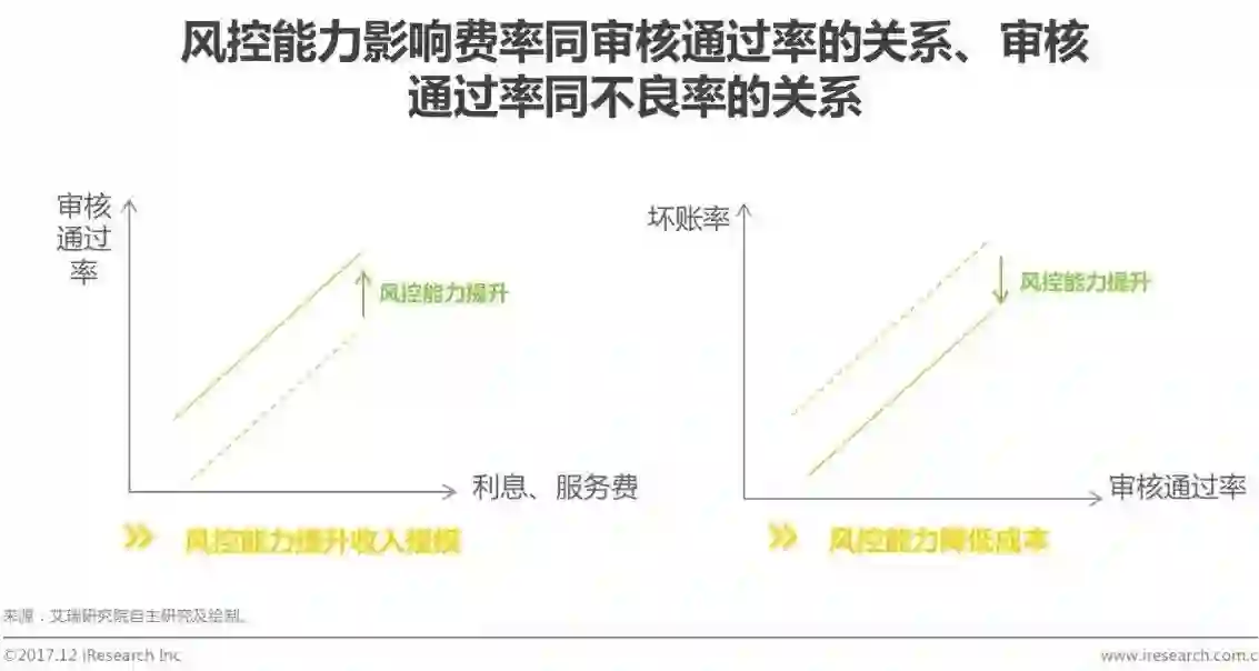 风控能力通过审核通过率、坏账率分别对收入规模、成本产生影响。通常情况下,一个平台的利息、服务费越高,定位的用户资信就会相对更差,审核通过率就会更高;而提升风控能力,能保证在利息、服务费不变的情况下审核通过率提升,从而扩大收入规模。同样地,审核通过率越高,平台越激进,则平台坏账率就会越高;而提升风控能力能实现在审核通过率一定的情况下坏账率下降,从而降低成本。
