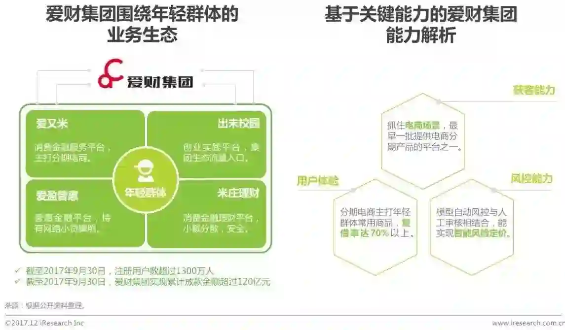 爱财集团致力于以金融科技拓展普惠金融的边界,为年轻人提供陪伴式场景金融服务。围绕年轻群体,爱财集团旗下涵盖年轻人消费金融服务平台爱又米、实践创业平台出未校园、互联网理财平台米庄理财、网络小贷平台爱盈普惠等,获取年轻客户群体的能力强。爱财集团旗下爱又米于2014年9月正式运营,截至2017年9月爱财集团实现累计放款金额超过120亿元,且平台复购率超70%,用户体验较好。