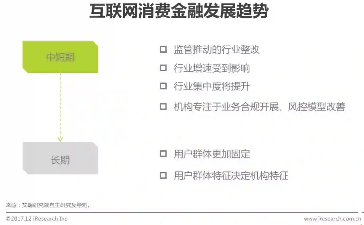 2018年,随着监管政策的逐步出台,互联网消费金融行业将迎来整改的时期,无资质的机构将难以开展互联网消费金融业务,不合规的开展方式将被剥离。中短期内,行业增速将受到影响,行业集中度将提升。在这一期间,业务的合规开展、风控模型改善、风控更加严格将是行业内机构的主攻方向。长期来看,平台的复借率将会逐步上升,不同平台将会拥有自身的长期用户,而这些用户特征将决定这些机构的特征。