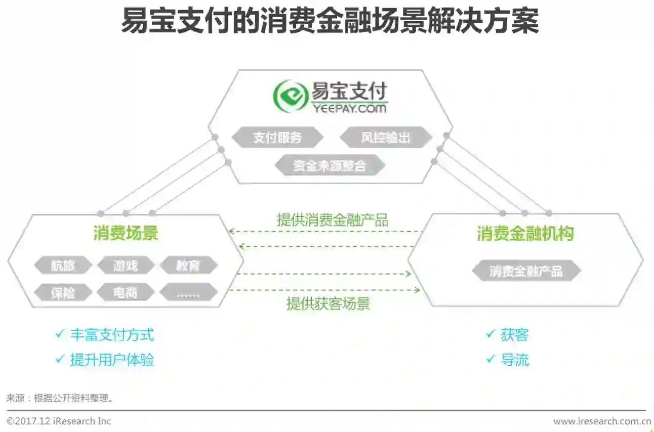 对于消费金融机构而言,场景越来越重要,而获取场景有两种方式,一种是直接切入消费,即对已有的消费场景进行布局、整合;一种是通过切入支付从而实现接入各消费场景,即通过支付公司接入支付公司已布局的消费场景。易宝支付是后者的解决方案提供商。