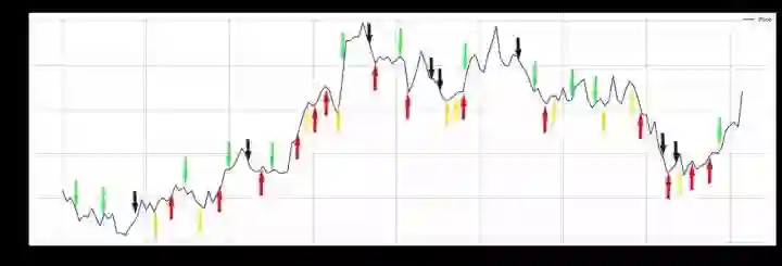 我们进行了当日短期投资模拟,上图为涨跌情况预测图。其中,红色箭头表示大涨,黄色箭头表示小涨,绿色箭头表示小跌,黑色箭头表示大跌。可见,虽然出现了几次预测相反的情况,但能有效捕捉到几个大涨大跌的点,准确度还是有一定保障的。