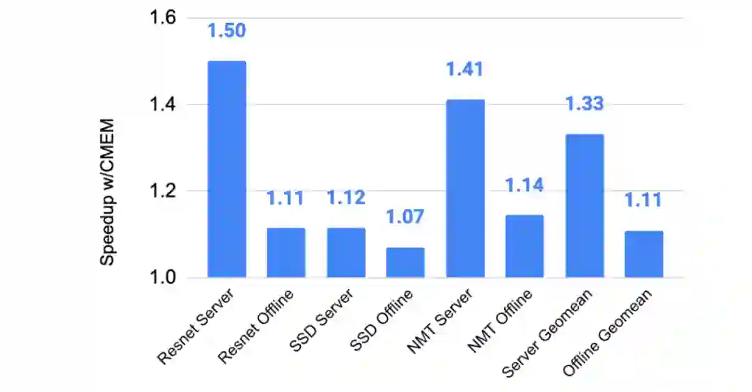 最后,下图展示了小于 128 MB 的 CMEM 对应用程序和 MLPerf 服务基准测试的影响。