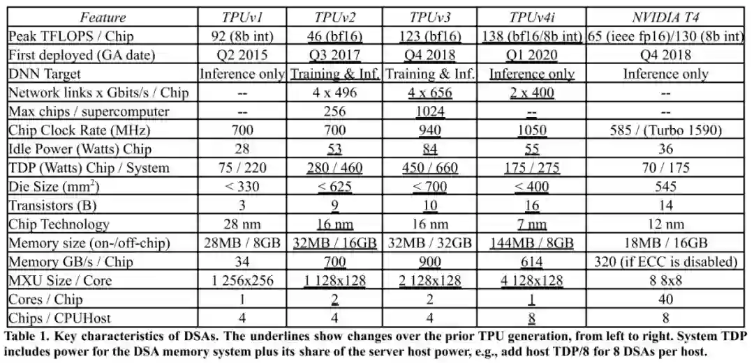 下表展示了几代 TPU 的关键特性,其中 TPUv4i 中 i 代表的是「推理」。