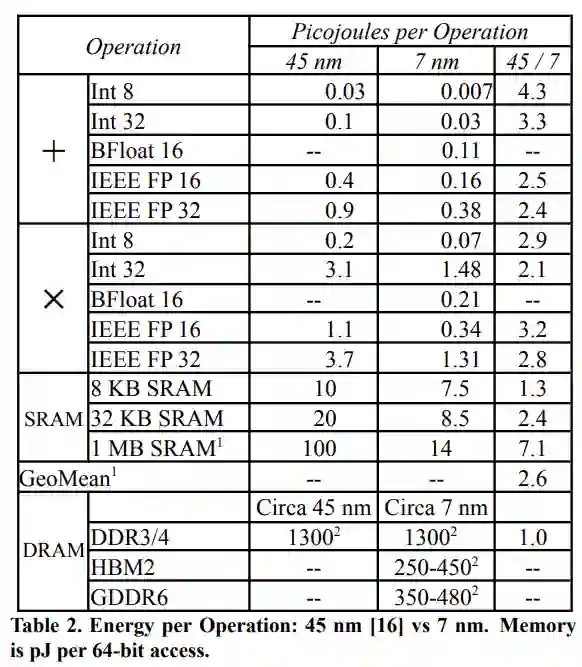 Horowitz 对操作功耗的见解启发了许多 DSA 的设计。表 2 显示 7 nm 相对于 45 nm 的平均增益是 2.6 倍,但并不均匀: