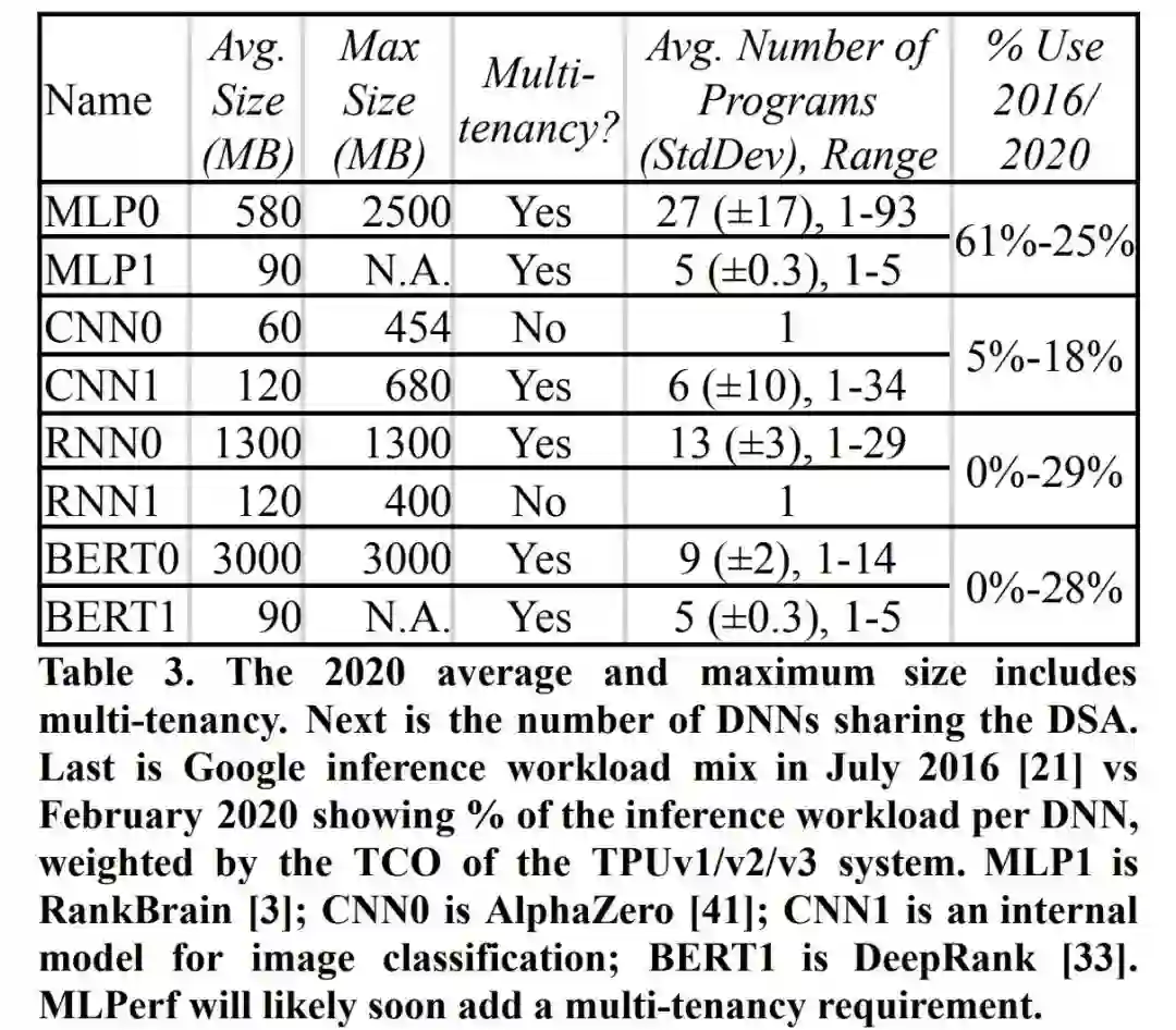 表 3 中的 DNN 约占谷歌 2020 年推理工作负载的 100%。2016 年的 MLP 和 CNN 仍然很受欢迎,尽管一些应用程序从 MLP 切换到 BERT DNN (28%)。BERT 出现于 2018 年,但它已经占了 28% 的工作负载。为了提高质量,transformer编码器加上 LSTM 解码器 (RNN0) 和 Wave RNN (RNN1) 取代了 LSTM (29%)。这个经验说明了可编程性和灵活性对于推理DSA的重要性。