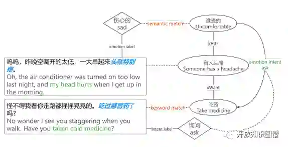 在图谱的边构建方面,研究人员提出了三种边来反映不同类型的对话流,并着重介绍了Head-Head Edge构建和Tail-Tail Edge的构建,一个事件流Head-Head Edge构建的图示如上图。下图展示了一个情感意向边(Emotion-Intent Edge)的构建过程。研究人员首先将“不舒服”的情绪与话语情感标签“悲伤”相匹配,随后发现在下一个文段中出现了吃药。因此,一个从“不舒服”到“吃药”的情感意向边被构建出来,并在边上添加了第二个话语“问”的意向标签,如下图所示