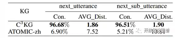 加入了ATOMIC-zh的对比结果显示出了该论文提出的事件流的有效性,其在文段匹配中显示出更高的连通性和更短的距离。此外,论文作者也提出了一些图谱任务,并将C3KG进行了任务测试。