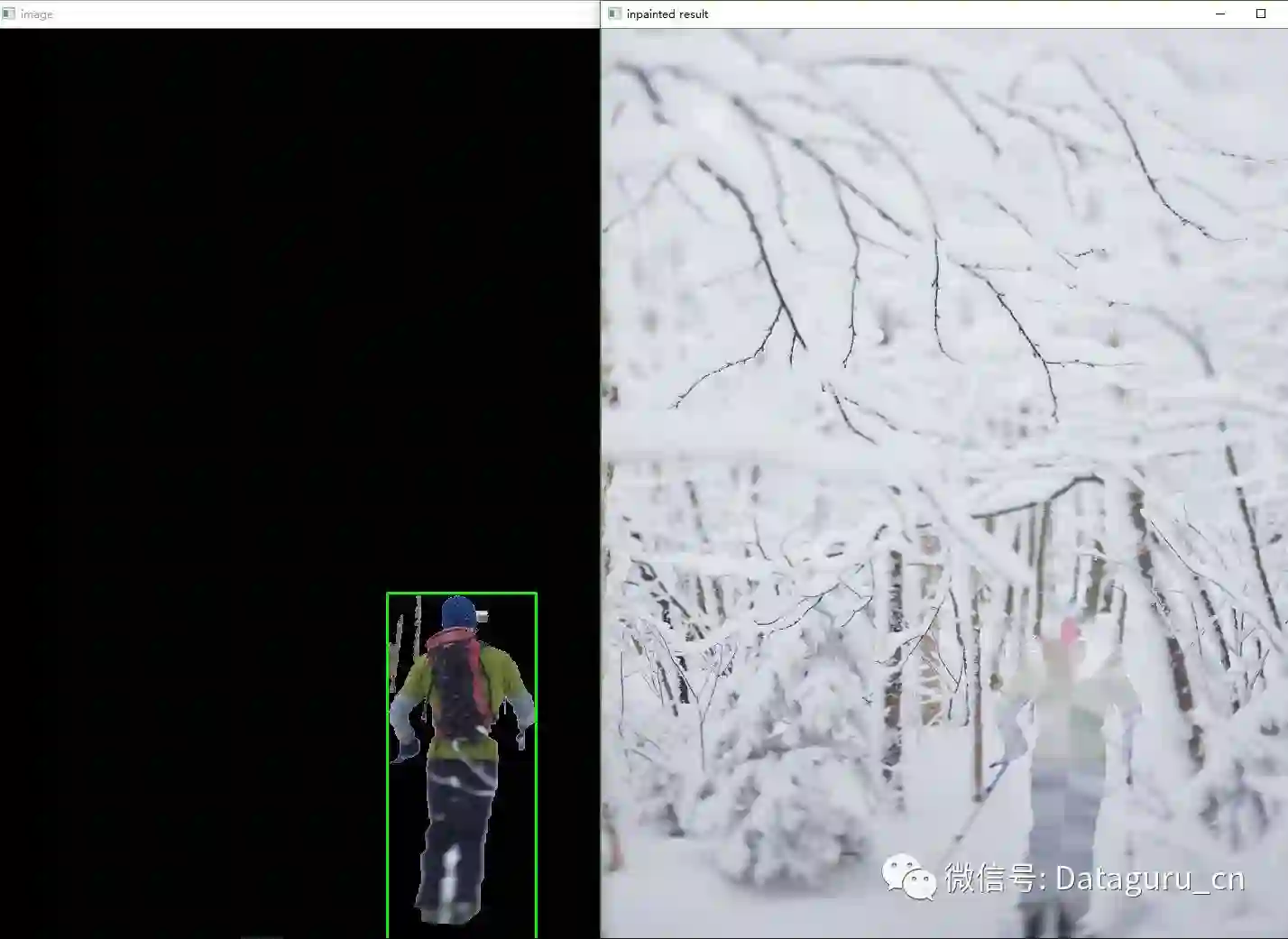 在OpenCV提供更多函数中,grabcut能够实现抠图,inpaint能够实现修补。那么把两者结合起来,就能够实现简单的“人像去除”功能,也就是框选一个人后,使用周围的景象对人像进行修补。虽然效果比不上PS,但是毕竟我们是以学习算法为目的的。