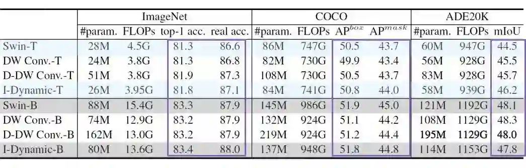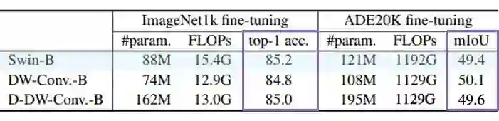 Depth-wise 卷积和 Local Attention 的设计原则如此相似,然而为什么 Local Attention 取得了如此高的表现力,而 Depth-wise 卷积没有呢?为了验证这一问题,文章使用 Depth-wise 卷积替换 Swin Transfomer 中的所有 Local Attention 模块,其他结构保持不变(per-LN 修改为 post-BN),同时为了验证动态 DW 卷积的效果,文章构建了两种 dynamic 特性的 Depth-wise 卷积: 1)D-DW-Conv. 第一种 dynamic DW 卷积,采用和普通 DW 卷积相同的权重共享方式,图像空间共享卷积核,通道间独立卷积核。并使用 Global Average Pooling 处理 input feature,然后通过 FC Layer 来 dynamic 预测出动态卷积核。 2)I-D-DW-Conv. 第二种 dynamic DW 卷积,采用和 Local Attention 相同的权重共享方式,每个像素(token)采用独立的聚合权重,而在 channel head(group)中共享权重。称为 Inhomogeneous Dynamic DW 卷积。 来看一看实验结果如何: