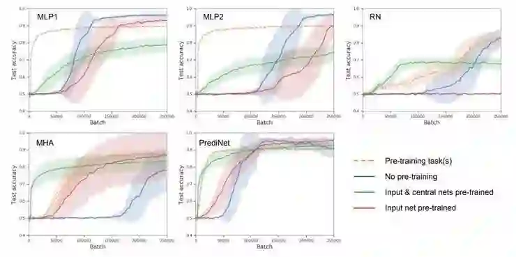 作者们对比的几种模型都带有一个卷积输入层、中央模块、以及一个用于输出的多层感知机;中央模块是区别所在,PrediNet 或者其他的基准模型。