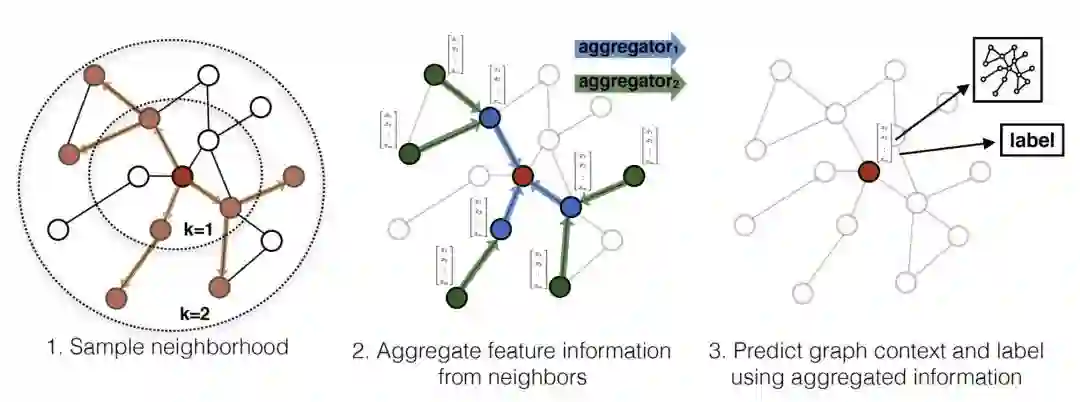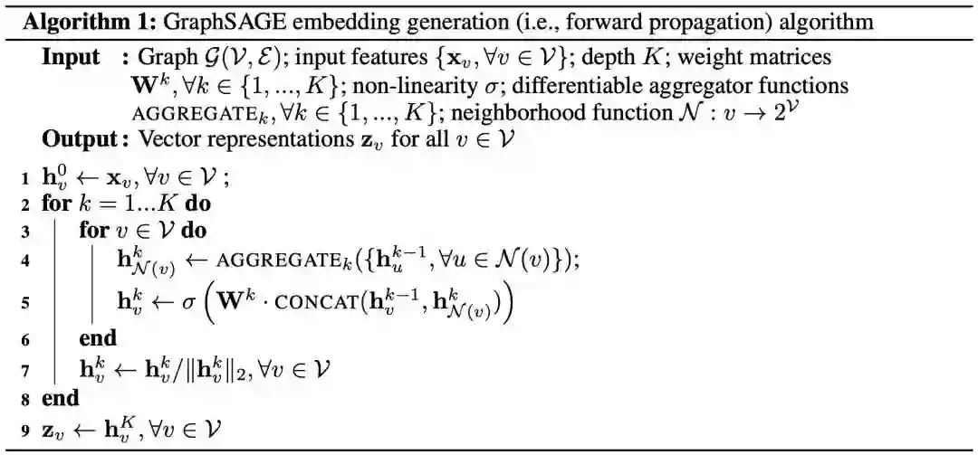 其中K表示每个节点能够聚合的邻居节点的跳数(例如K=2时,每个顶点可以最多根据其2跳邻居节点的信息来表示自身的embedding向量)。算法直观上是在每次迭代中,节点聚合邻居信息。随着不断迭代,节点得到图中来自越来越远的节点信息。