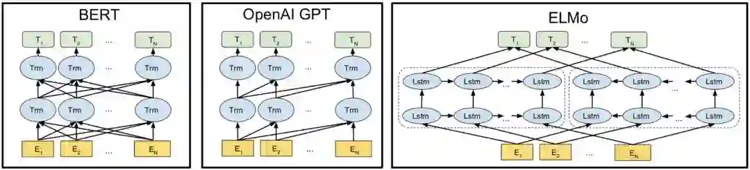 BERT (Bidirectional Encoder Representations from Transformers)是Goole在2018年10月发表的,当时刷新了11项NLP任务,从此成为NLP领域“最靓的仔”。BERT、ELMo和GPT模型结构对比图如下图所示:
