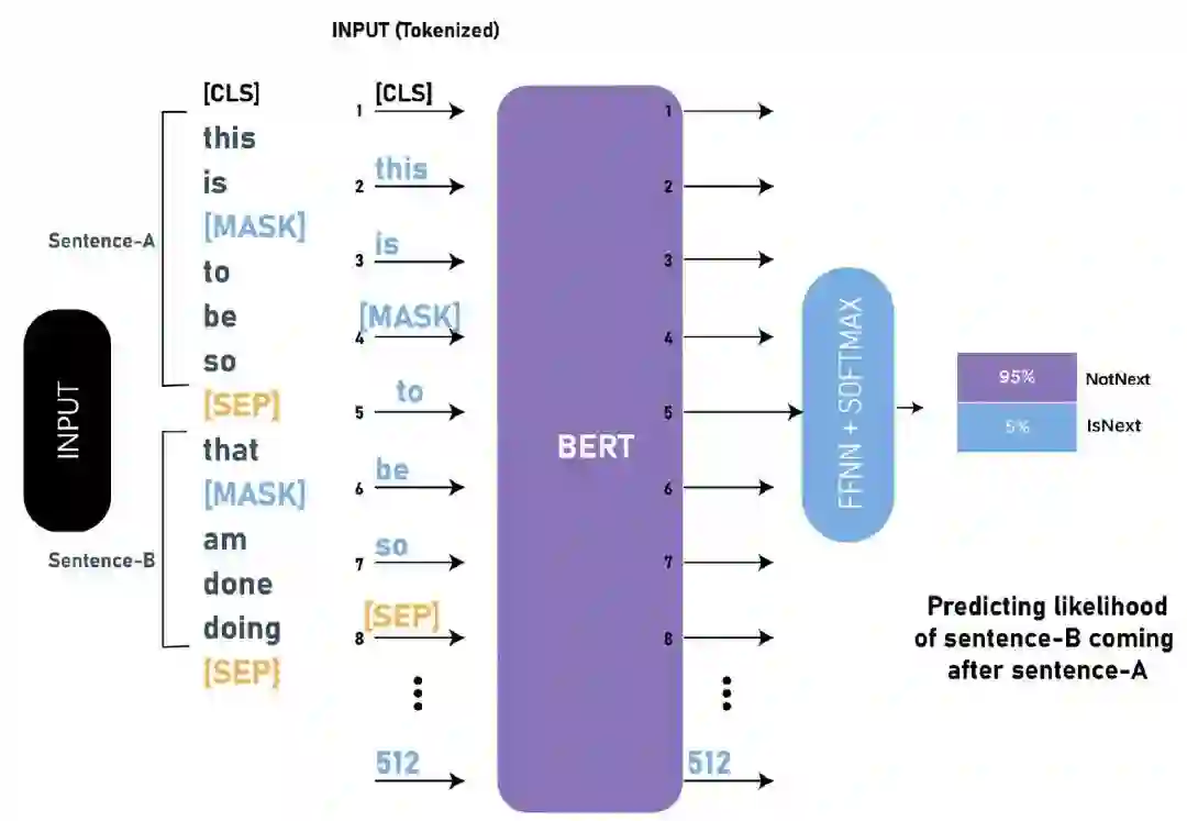 许多重要的下游任务譬如QA、NLI需要语言模型理解两个句子之间的关系,而传统的语言模型在训练的过程没有考虑句对关系的学习。BERT采用NSP任务来增强模型对句子关系的理解,即给出两个句子A、B,模型预测B是否是A的下一句,如下图所示: