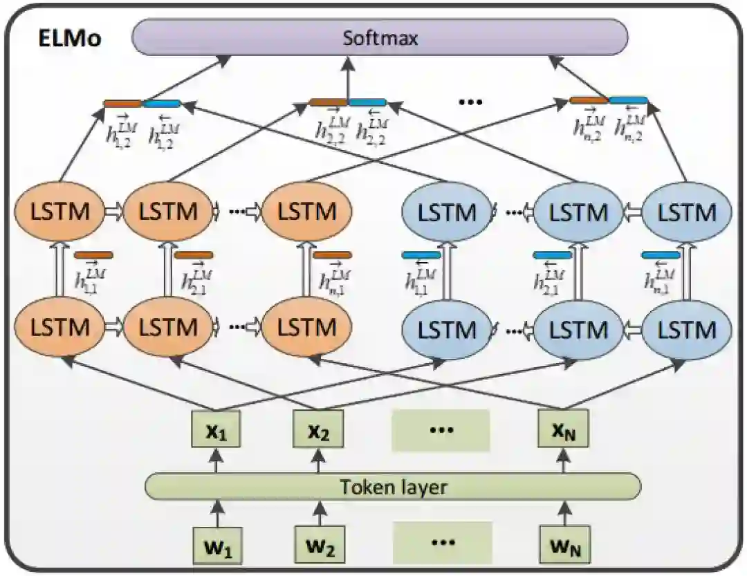 ELMo(Embeddings from Language Models)是2018年3月发表,获得了NAACL18的Best Paper。ELMo的模型结构如下图所示: