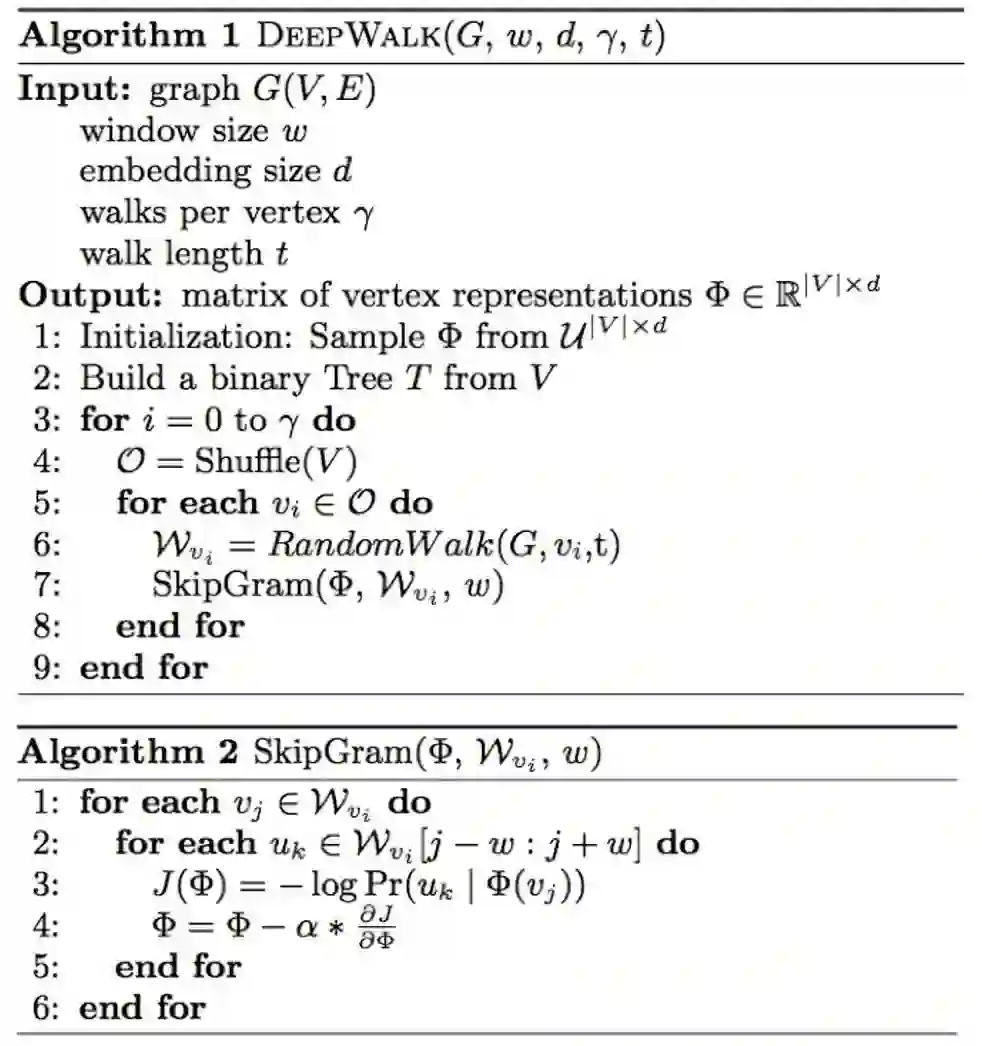 其中, 表示及节点 的所有出边连接的节点集合, 表示由节点 连接至节点 的边的权重。由此可见,原始DeepWalk算法的跳转概率是跳转边的权重占所有相关出边权重之和的比例。算法具体步骤如下图所示: