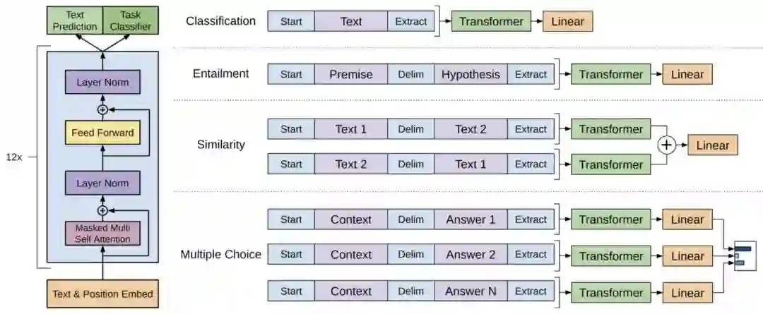 总体来说,Fine-tuning阶段需要的额外参数是 和以隔符token的embedding。其他任务迁移的输入格式可参考下张图: