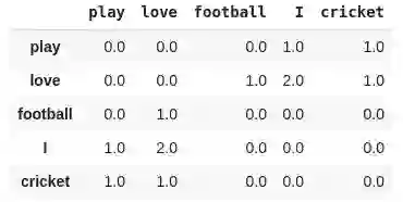 在特定大小的窗口内共同出现的次数。如对于语料:I play cricket, I love cricket and I love football,窗口为2的的共现矩阵可以表示为: