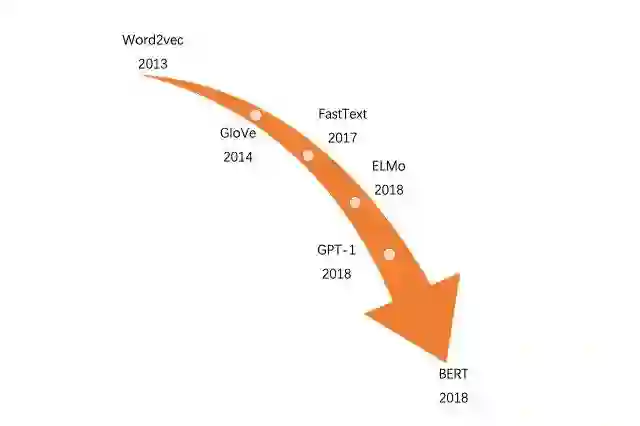 对于基于内容的embedding方法,主要是针对文本类型数据(对图像、音视频等多媒体数据embedding方法,感兴趣的可以自行查阅相关技术)。下图是从word2vec到BERT的发展历史(最新已经发展到了GPT3了,模型更新太快,还没来得及用,就已经过时了),从图中可以看出自从2013年word2vec横空出世后,文本embedding方法不断被优化。从最开始的静态向量方法(如word2vec、GloVe和FastText)发展为能根据上下文语义实现动态向量化的方法如(ELMo、GPT和BERT)。下面主要从分静态向量和动态向量两个方面来介绍相应的方法。