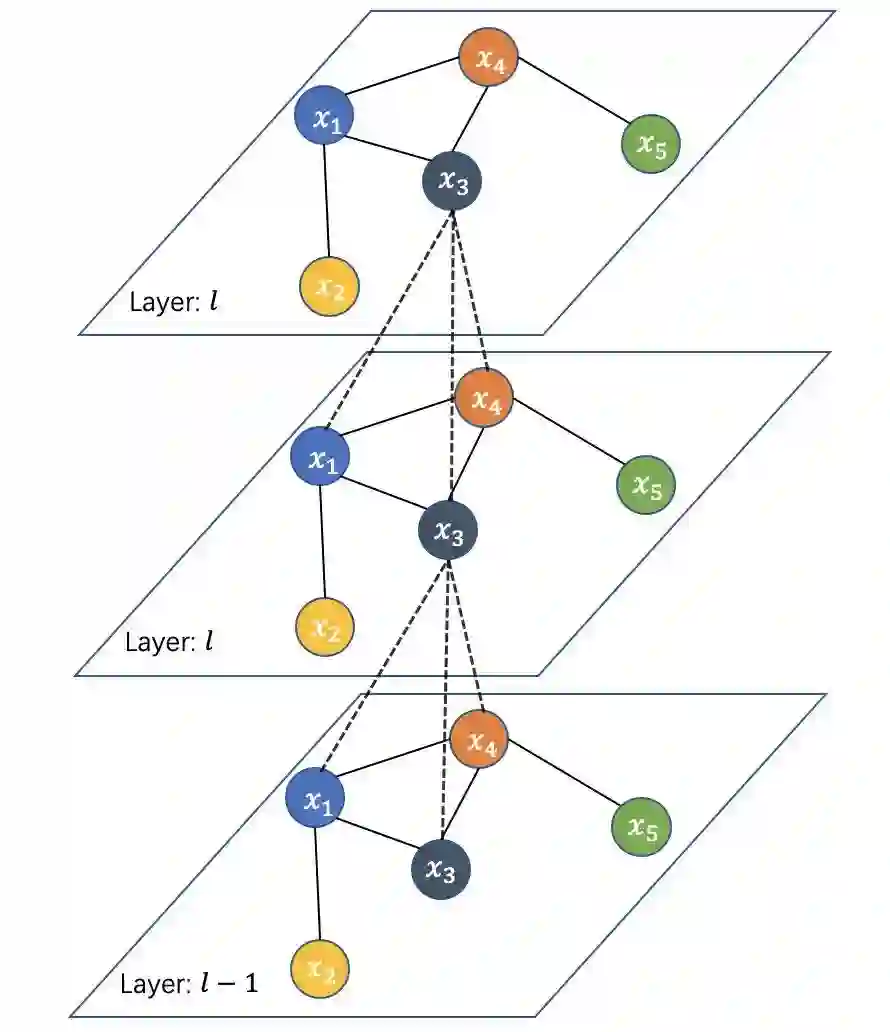 Thomas等人在2017年对上式做了进一步简化:限制每个卷积层仅处理一阶邻居特征,通过采用分层传播规则叠加多层卷机,从而实现对多阶邻居特征的传播。通过限制卷机核的一阶近似能缓解节点度分布非常宽的图对局部邻域结构的过度拟合问题。如下图所示,通过集联多个卷积层,节点 能聚合多个邻居节点特征。