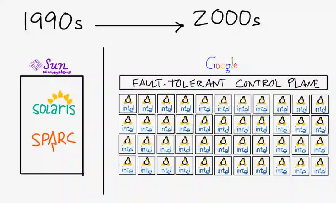 不久前,英特尔还是一个来降维打击的角色。服务器市场最初的主导者是 Sun 微系统公司这样的综合性公司,其产品价格很高,后来 PC 营收的暴涨使得英特尔快速提升性能同时降低价格。当然,PC 的可靠性无法与集成服务器相比。但在本世纪初谷歌就意识到,其所提供服务的规模和复杂度意味着构建真正可靠的堆栈是不可能的事情,解决方案是基于(相对)廉价的英特尔 x86 处理器构建数据中心。