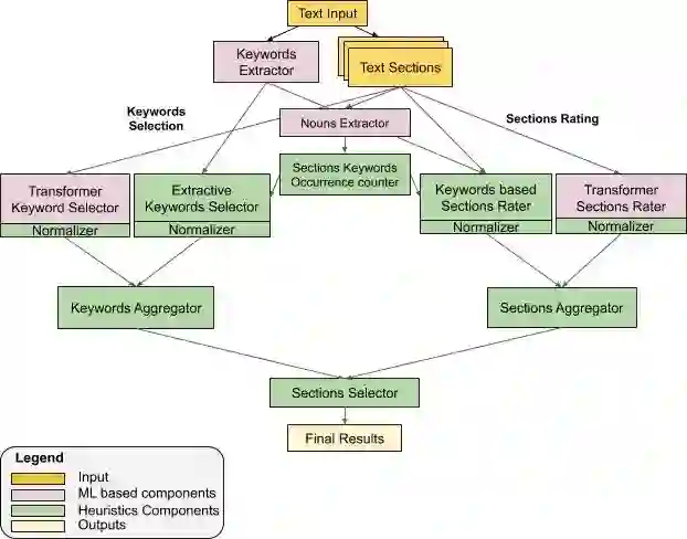 在每项任务中,我们都使用了两种不同的自然语言处理 (NLP) 方法:基于 Wikipedia 数据集中数据进行预训练的精简版双向 BERT 模型,以及经过精简的词频-逆文本频率 (TF-IDF) 模型。我们并行使用双向 Transformer 和基于 TF-IDF 的模型进行关键字提取和重要部分识别任务,同时使用聚类启发式算法,这样既能够利用每种方法的优势,又能避免它们各自的弊端(在下一节讨论)。