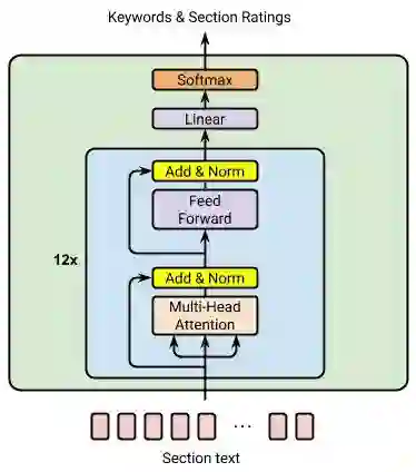 下一个任务是确定哪些部分信息丰富且具有独特性,并将其突出显示。为了完成此任务,我们再次结合使用上述两个模型,评估每个部分的重要性,并生成对应的分数。我们通过获取该部分中所有关键字的 TF-IDF 得分,并根据其在该部分中的出现次数加权,然后计算这些单个关键字得分的总和,计算出第一个分数。我们通过双向 Transformer 模型运行各部分文本,并以此计算第二个分数,该模型也接受了各部分评分任务的训练。标准化并合并两个模型生成的分数,得出各部分的分数。