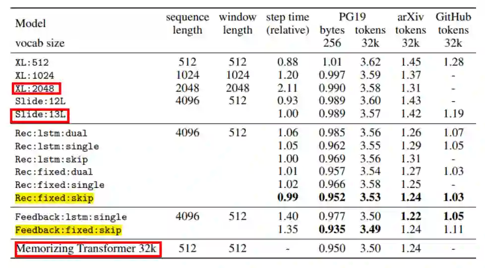 可以看到,这个模型的效果其实和本文方法相差不大,但复杂度要高很多,运算时延也要长[1]。虽然...但是,本文并没有把 Memorizing Transformer 的 step time 明确写在表格中。个人感觉有些不妥。
