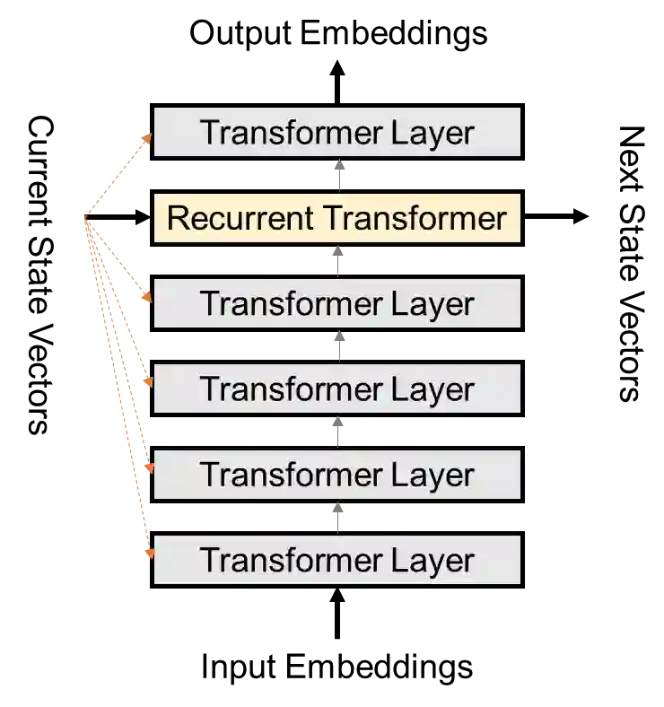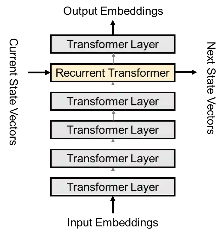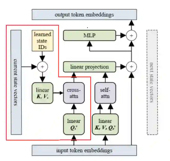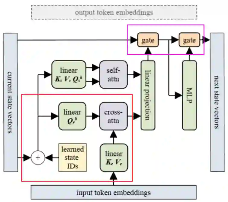 和传统的 Transformer layer 非常相像,差别只集中在红框标识出来的部分。在这一部分中,为了融合上一个循环单元给的 current state 信息,他们将 input embeddings 和 current state vectors 做了一个 cross attention。另一方面,input embeddings 自身也会过一个 self-attention 层。这两部分拼接后,通过线性层融合在了一起。